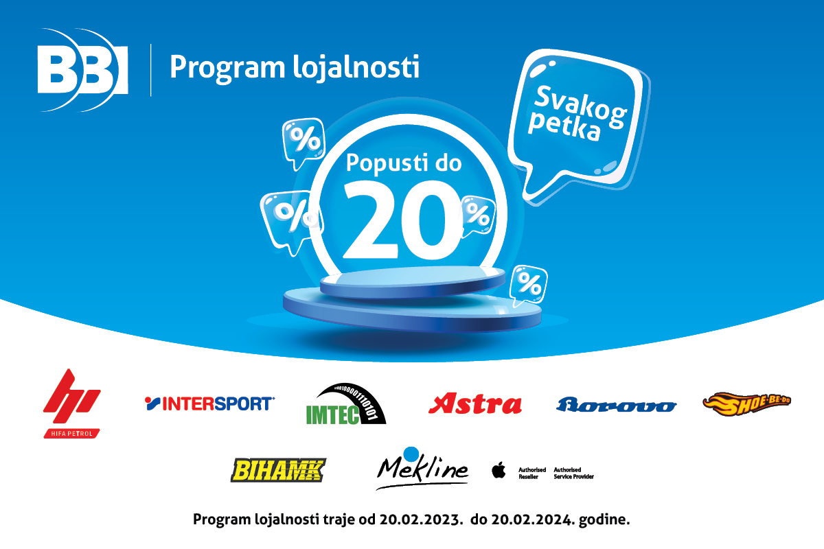 Svakog petka, u periodu od 20.02.2023. godine do 20.02.2024. godine, plaćajući bilo kojom BBI platnom karticom, mogu se ostvariti značajni popusti i do čak 20 posto, kod odabranih trgovaca/partnerskih kompanija: Hifa Petrol, Astra Borovo, Intersport, Imtec, Mekline, BIHAMK.