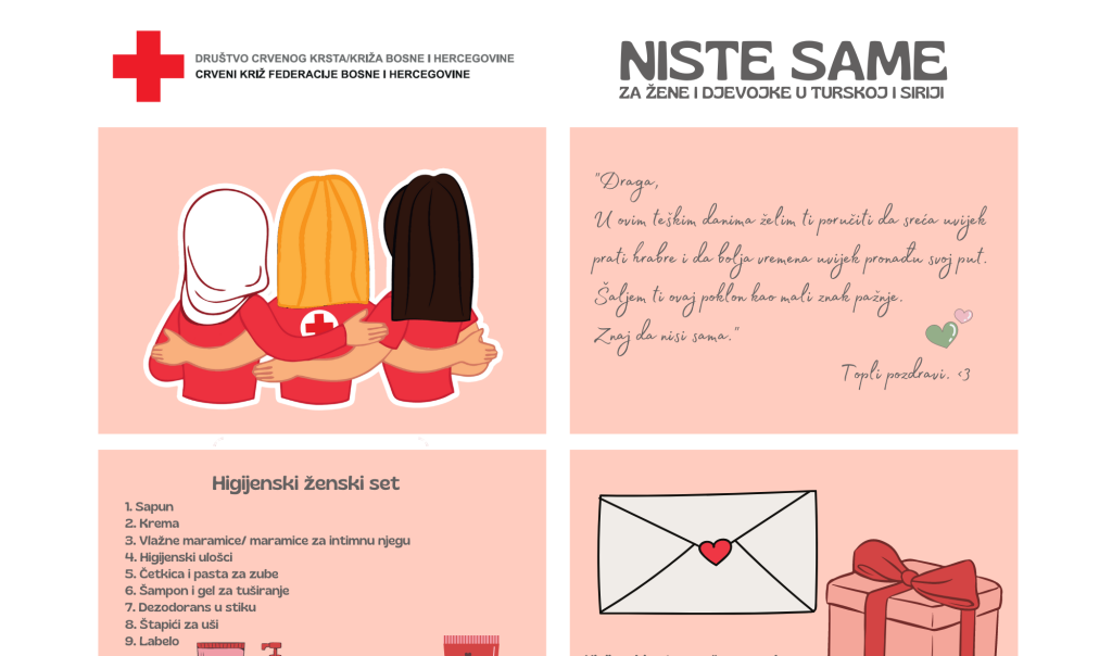 Crveni križ Federacije BiH pokrenuo je kampanju „NISTE SAME za žene i djevojke u Turskoj i Siriji“. Cilj je prikupiti što više osnovnih higijenskih paketa za žene i djevojke koje su ostale bez svojih domova te im bar na kratko izmamiti osmijeh i ublažiti patnju.
