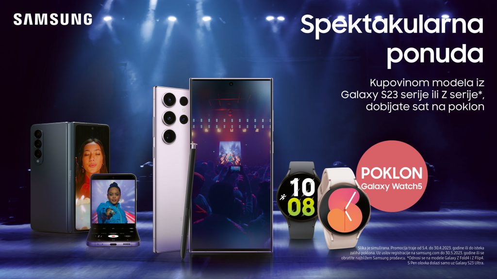 Kompanija Samsung pripremila je posebnu ponudu u okviru koje korisnici kupovinom Galaxy S23 ili Z serije pametnih telefona na poklon dobijaju Samsung Galaxy Watch5 pametni sat 44 mm u grafitnoj boji ili Samsung Galaxy Watch5 40 mm u ružičasto-zlatnoj boji. Promocija traje od 5.4.2023. do 30.4.2023. ili do isteka zaliha poklona.