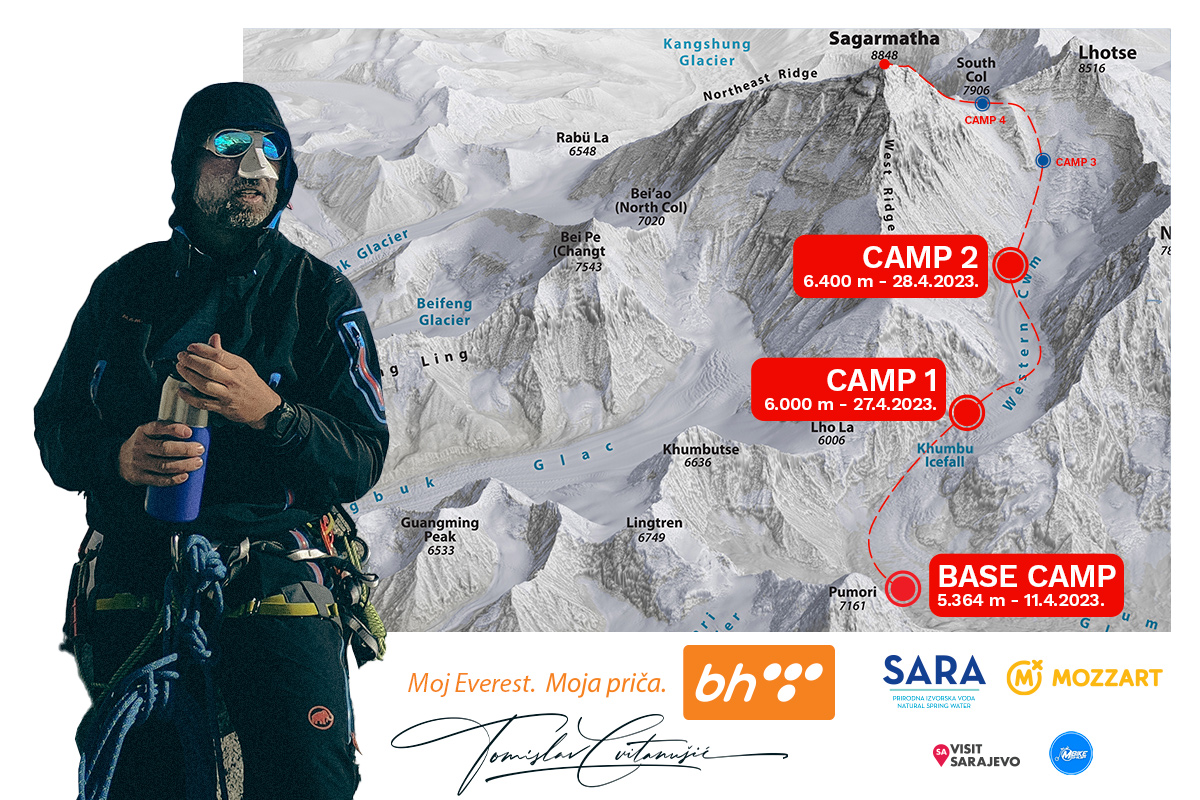 „Tomo i njegova grupa bi se trebali odmoriti kada dođu na 6.000 metara i onda produžiti na 6.400. Ukoliko se budu dobro osjećati, tu bi trebali prespavati, a na visinskim kampovima bi trebali provesti tri noći. Sa tog mjesta će ugledati vrh Everesta, što će i njihov moral sigurno podići i dati im dodatnu snagu. Sa ovim 4-dnevnim usponom, Tomo će pokušati da pređe visinu od 7.000 metara i da dođe do trećeg baznog kampa na oko 7.300 metara, kako bi svoj organizam prilagodio toj visini“, istakao je Gafić.