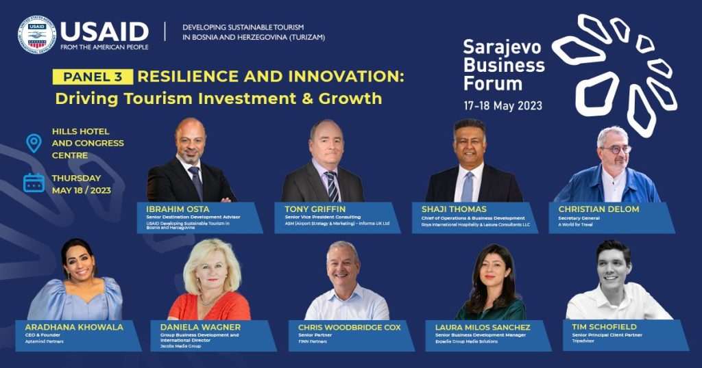 U okviru Sarajevo Business Foruma, u 10:00 sati, održat će se panel „Otpornost i inovacije: Podsticanje investicija & rasta u sektoru turizma“, koji se sastoji od dvije sesije: Reputacija, reputacija, reputacija: Moć brenda kao katalizatora za privlačenje investicija i međunarodnog kapitala i Strategije za rast investicija i profitabilnost u sektoru turizma. Učesnici panela – osam vrhunskih stručnjaka iz Ujedinjenih Arapskih Emirata, Velike Britanije, Francuske i Sjedinjenih Američkih Država prenijet će svoja iskustva iz ove oblasti. Medijima će se obratiti direktor Ureda za ekonomski razvoj USAID/BiH Karl Wurster te viša menadžerica za poslovni razvoj kompanije Expedia Group Media Solutions Milos Sanchez. Kurator i moderator ovog panela je viši savjetnik za razvoj destinacije na projektu USAID Turizam Ibrahim Osta.