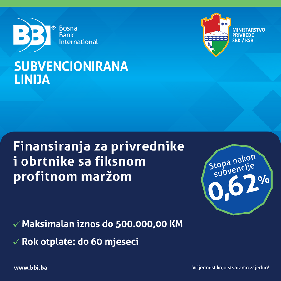 Privrednici i obrtnici sa područja Srednjobosanskog kantona u narednom periodu u BBI banci mogu ugovoriti povoljna finansijska sredstva, sa fiksnom profitnom maržom od 0,62% i sa rokom otplate do 60 mjeseci.