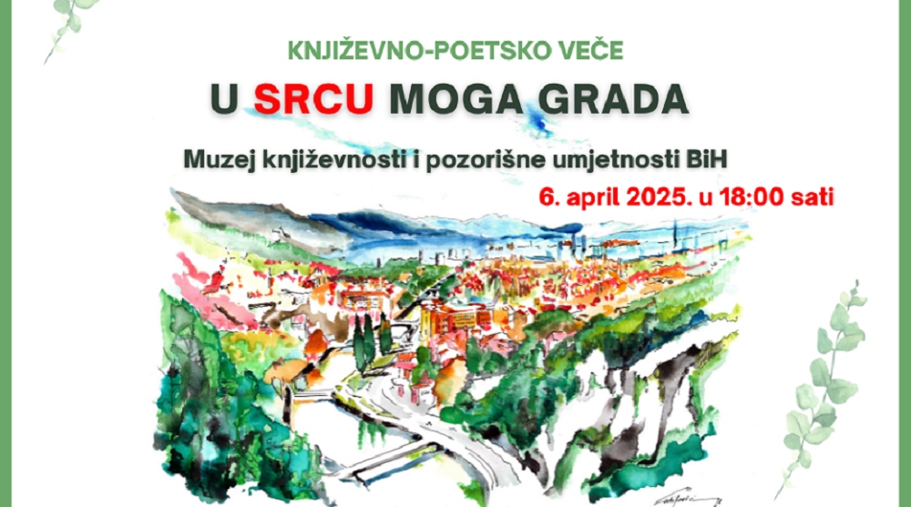 U nedjelju, 6. aprila povodom Dana grada Sarajeva, u organizaciji Udruženja “Sevdah Salon Balkan” i uz pokroviteljstvo Grada Sarajeva, u Muzeju književnosti i pozorišne umjetnosti Bosne i Hercegovine bit će održano Književno-poetsko veče “U srcu moga grada”. S početkom u 18:00 sati publika će imati priliku poslušati interpretacije djela sarajevskih književnika Gorana Simića, Feride Duraković, Amele Marin, Azre Islamagić Mulahmetović i Zvonimira Nikolića. Odlomke će kazivati glumica Emina Minka Muftić, uz muzičku pratnju podpredsjednice Udruženja „Sevdah Salon Balkan“ i violinistice Dine Krilić, zatim Emine Bajtarević i Perice Ramljaka.