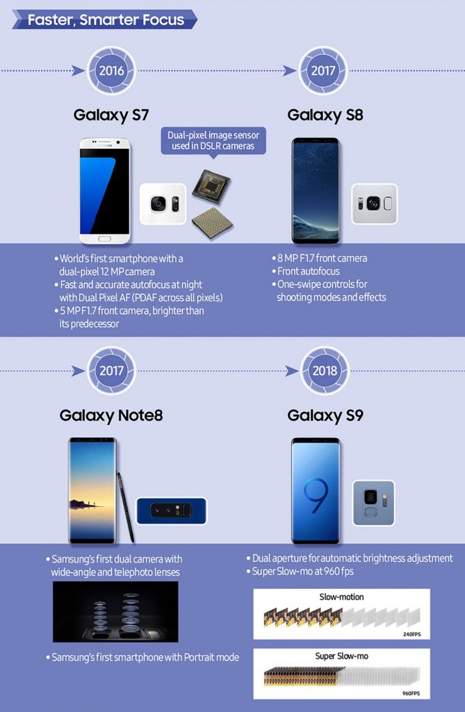 Galaxy S7 bio je prvi pametni telefon s Dual Pixel senzorom, poznatim iz DSLR fotoaparata, čime su brzina fokusiranja i kvalitet fotografija doživjeli ogroman napredak. Galaxy Note8 potom je uveo dvostruku zadnju kameru, otvarajući put današnjem trendu višestrukih kamera.