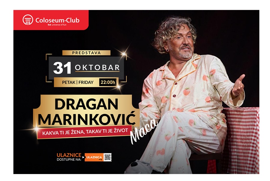 Jedan od najpopularnijih glumaca i komičara u regionu, Dragan Marinković – Maca, ponovo dolazi pred sarajevsku publiku, gdje će prvi put na sceni Coloseum Cluba izvesti svoju popularnu predstavu „Kakva ti je žena, takav ti je život“! U petak, 31. oktobra u 22:00 sata, publika će imati priliku da uživa u večeri ispunjenoj smijehom i neponovljivom energijom koju samo Maca zna prenijeti.