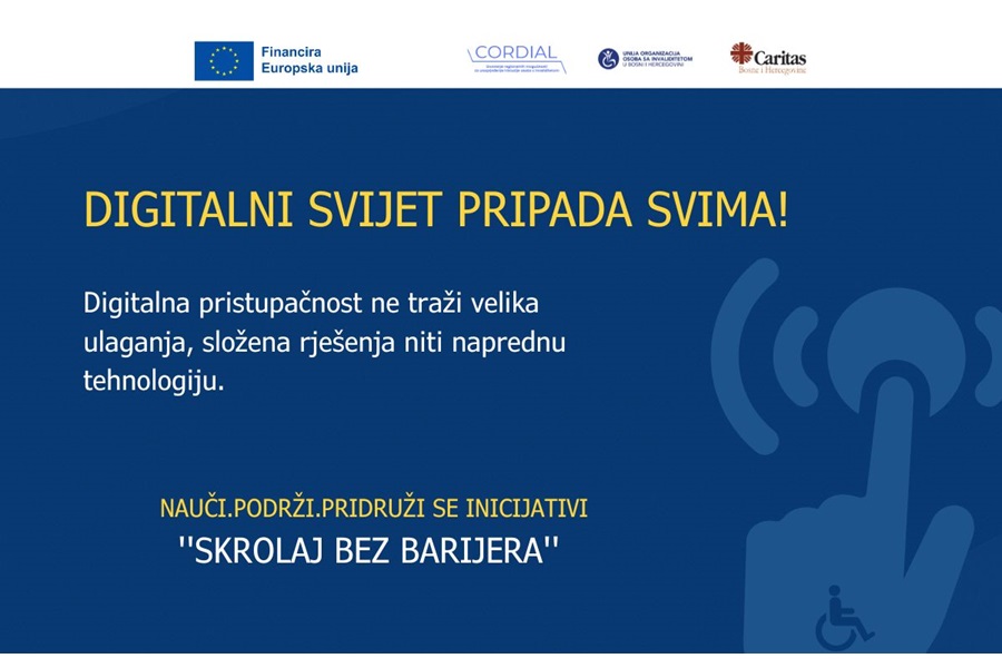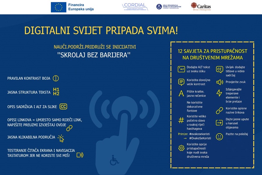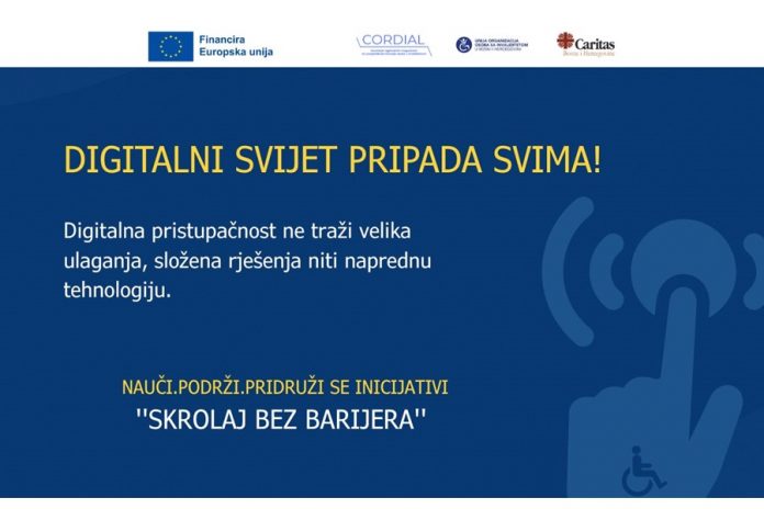 Kako bi široj javnosti približio važnost online pristupačnosti i konkretne načine kako ju primijeniti u svakodnevnoj praksi, Caritas Bosne i Hercegovine provodi informativnu kampanju ‘’Skrolaj bez barijera’’ u okviru projekta CORDIAL i suradnji s Unijom organizacija osoba s invaliditetom u BiH uz financijsku potporu Europske unije.