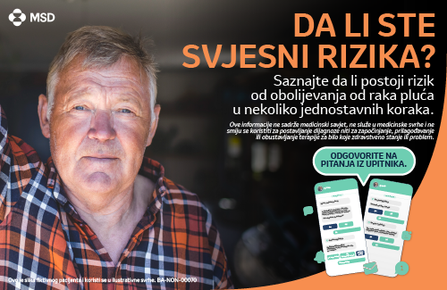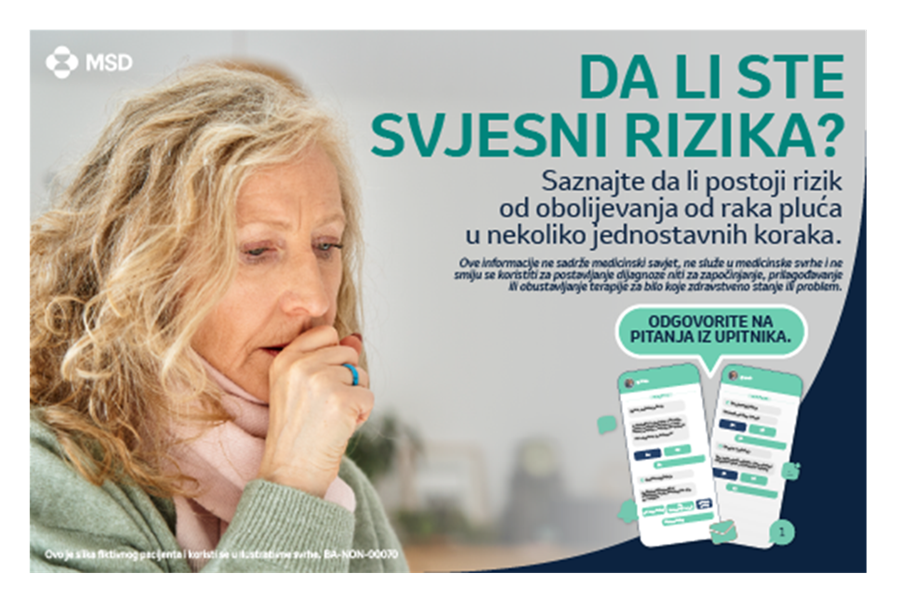 Brza i besplatna procjena rizika Besplatan orijentacioni online upitnik dostupan je na web stranici rak-pluca.ba a u nekoliko jednostavnih koraka omogućava inicijalnu procjenu rizika od obolijevanja od raka pluća. Po završetku, korisnici dobijaju sažetak procjene koji im može pomoći da razumiju i odluče treba li da potraže mišljenje ljekara. Treba imati na umu da ovaj upitnik ne zamjenjuje medicinsku dijagnozu, ali predstavlja prvi korak ka ranom otkrivanju bolesti i podizanju svijesti o važnosti pravovremene reakcije i prevencije. Rano otkrivanje je ključno Što se bolest ranije otkrije, prognoza je bolja i prije se može započeti liječenje, kažu stručnjaci. Rana dijagnoza značajno povećava mogućnosti uspješnog liječenja jer je na raspolaganju više opcija liječenja i doslovno može spasiti život. Nažalost, mnogi ljudi odgađaju odlazak ljekaru jer misle da je kašalj bezopasan ili da će simptomi proći sami od sebe. Zato se rak pluća često otkriva tek u kasnim fazama, kada su opcije liječenja ograničene. Faktori rizika i simptomi koje ne treba zanemariti Osim pušenja i pasivnog pušenja, drugi faktori rizika uključuju sve veće zagađenje i izduvne gasove dizel motora, izloženost radonu (po podacima SZO radon je najveći uzročnik raka pluća kod nepušača i drugi najveći kod pušača), zračenje, genetički faktori i izloženost drugim materijama koji nas čine podložnim razbolijevanju.