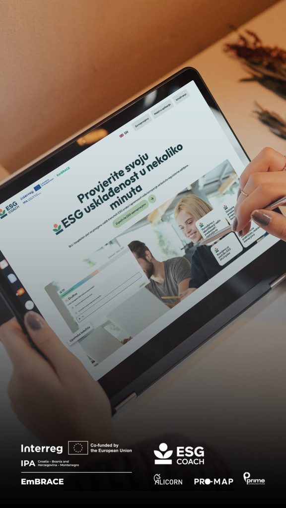 Često se u regioni čuju ove ili slične rečenice: „Nemamo kapaciteta“, „ESG nije za nas“, „To je priča za velike korporacije“. Ipak, iskustvo pokazuje suprotno, upravo mala i srednja preduzeća mogu najviše profitirati ako uvedu ESG principe na vrijeme. Platforma ESG Coach nastala je iz istraživanja koje je jasno pokazalo gdje se regiona nalazi: znanje postoji, ali su alati i podrška nedostajali. Zato je ESG Coach lokalizovan, jednostavan i prilagođen realnim potrebama firmi iz Bosne i Hercegovine, Hrvatske, Srbije i Crne Gore. Uz ovu platformu, ESG postaje razumljiv, praktičan i dostupan svima, i to bez dodatnih posrednika i komplikovanih procedura.