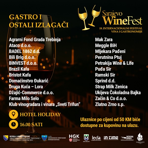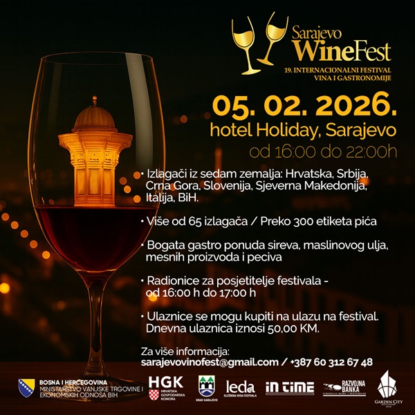 Sve je spremno za vinsku čaroliju – 19. izdanje Internacionalnog festivala vina i gastronomije „Sarajevo wine fest 2026“. Jedan od najvećih festivala vina i gastronomije u našoj zemlji i regiji ove godine bit će održan 5. februara u sarajevskom hotelu Holiday.