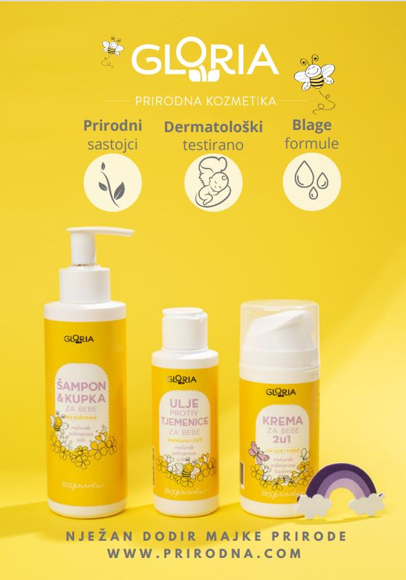 Prilikom formuliranja baby kolekcije prirodna kozmetika Gloria vodila se krilaticom „manje je više“ te je iz prirodeodabrala minimalan broj najkvalitetnijih organskih sastojaka. Najnježnija hladno prešana ulja noćurka i badema, te eterično ulje palmarose zbog svog protuupalnog učinkabila su osnovna baza za nastanak tri proizvoda koji poštuju i posebno njeguju nježnu bebinu kožu.